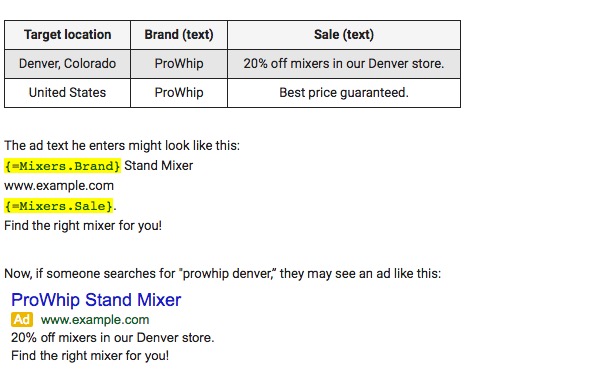 Scott now runs a chain of kitchen supply stores throughout the United States. He wants his ads to highlight discounts offered in his stores that people are near. Ad customizers let him offer location-specific information using only one ad. All he needs to do is upload ad customizer data with the details associated with each location. A line from this ad customizer spreadsheet might look like this: